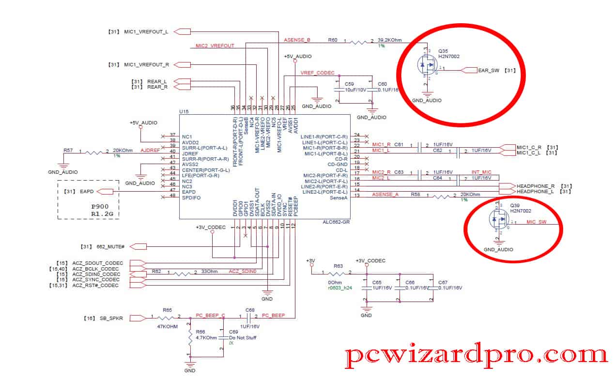 Here is the schematic from the laptop, to see how this transistors are connected to the sound card chip ALC662.